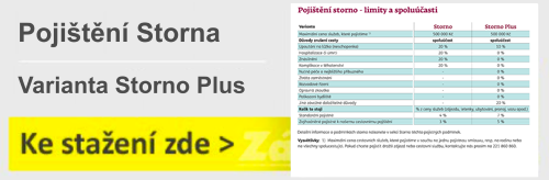Pojištění storna Vám může ušetřit mnoho peněz, pokud budete nuceni zájezd zrušit (letenky nebo ubytování). Pojištění storna můžete vyjednat ve dvou variantách a jeho cena se počítá podle Vašeho výběru z celkové ceny zájezdu (pobyt a letenka) nebo jen z ceny za pobyt. Varianta Storno Plus je rozsáhlá ochrana pře nástupem na cestu a zároveň v případě přerušení cesty až do 100 % ceny zájezdu bez spoluúčasti. Rozšířené důvody na stornování anebo přerušení cesty. Pojištění Storna Štandard vás ochrání v případě nenastoupení na cestu anebo při přerušení cesty s 10% alebo 25% spoluúčastí.