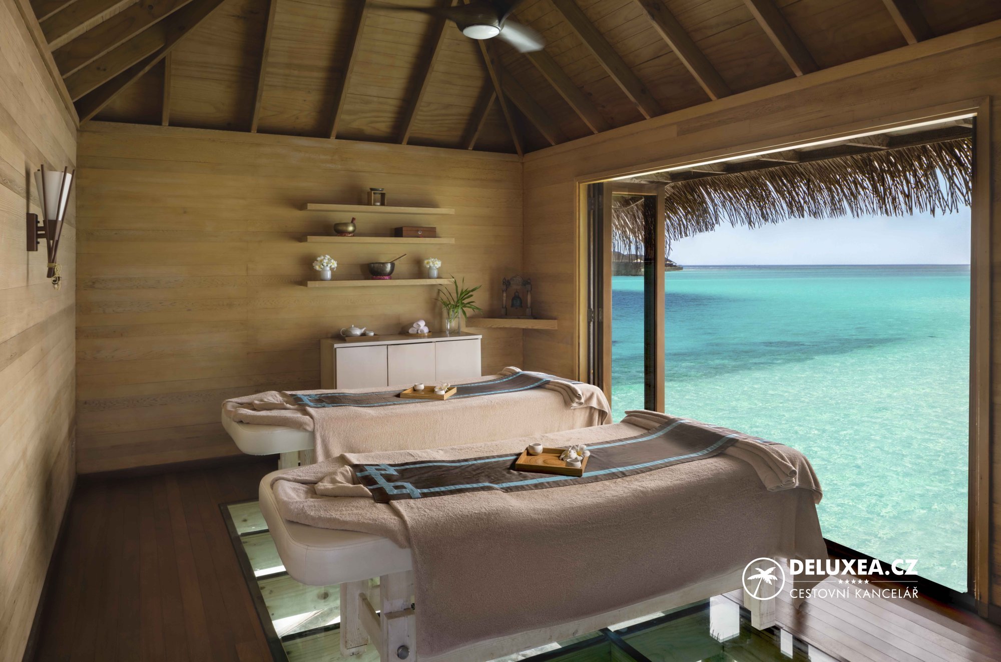 Overwater Spa: Spa nad vodou na ostrově Rangali s místnostmi pro procedury se skleněnou podlahou, které poskytují jedinečný wellness zážitek.